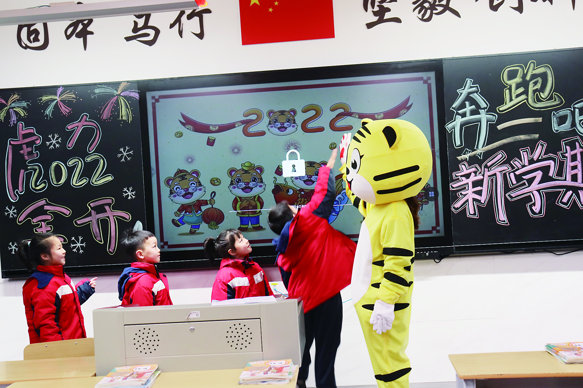 同样,在北星小学、八达小学、荷塘小学,手拿祝福语的“虎宝宝”来到各个班级和学生们相聚。“虎力全开”“虎虎生威”……学生们手持各种励志语为自己鼓劲。此外,北星小学还有不少学生将自己制作的“福”字作品贴在校门集福墙上。