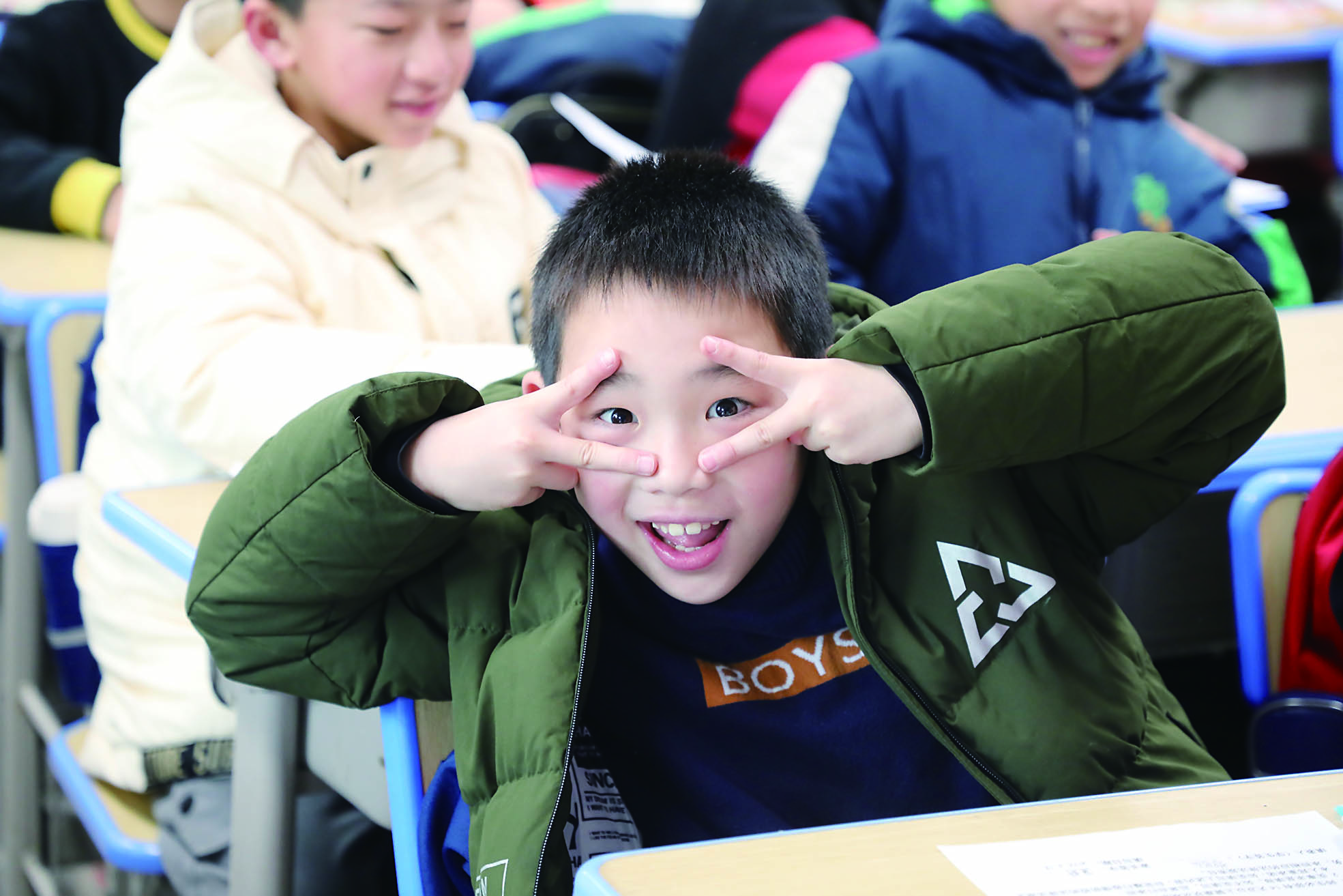 ▲新学期,我们一起比个“耶”。图为白鹤小学学生。 记者/孙晓静 通讯员/邓孟晶 摄