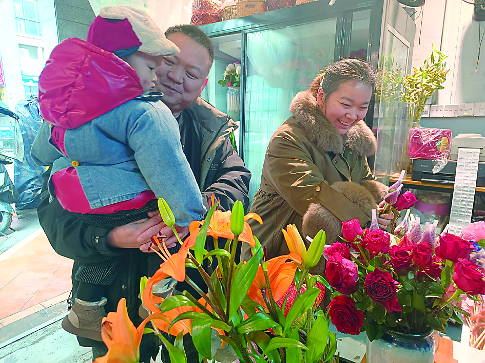 ▲专注线上的袁菲,通过驿站引流,也逐渐网罗了一批客户。图为附近居民在为妻子生日选购花束。 记者/成姣兰 摄