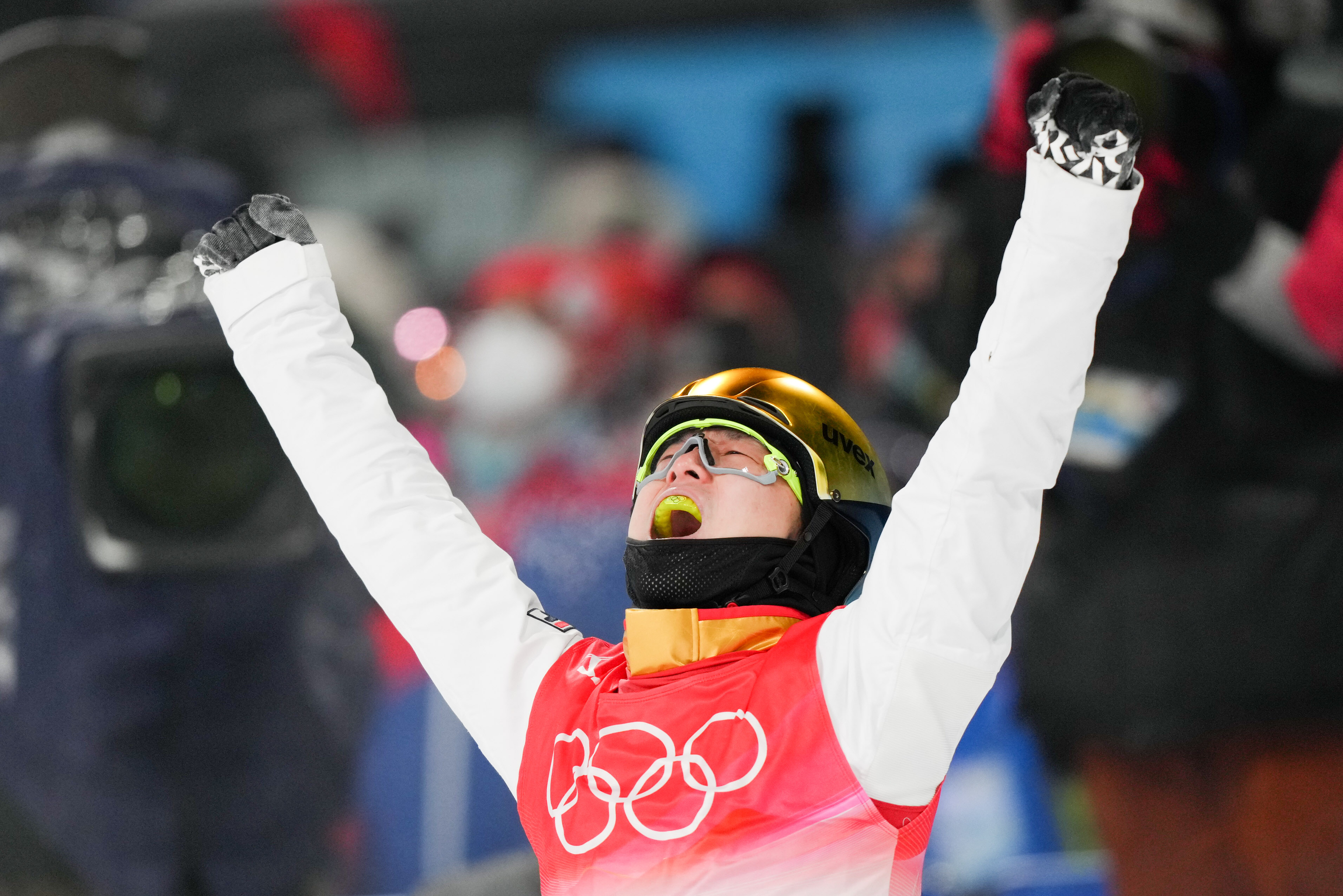 ▲2月16日,中国选手齐广璞完成动作后庆祝。新华社记者/薛玉斌 摄