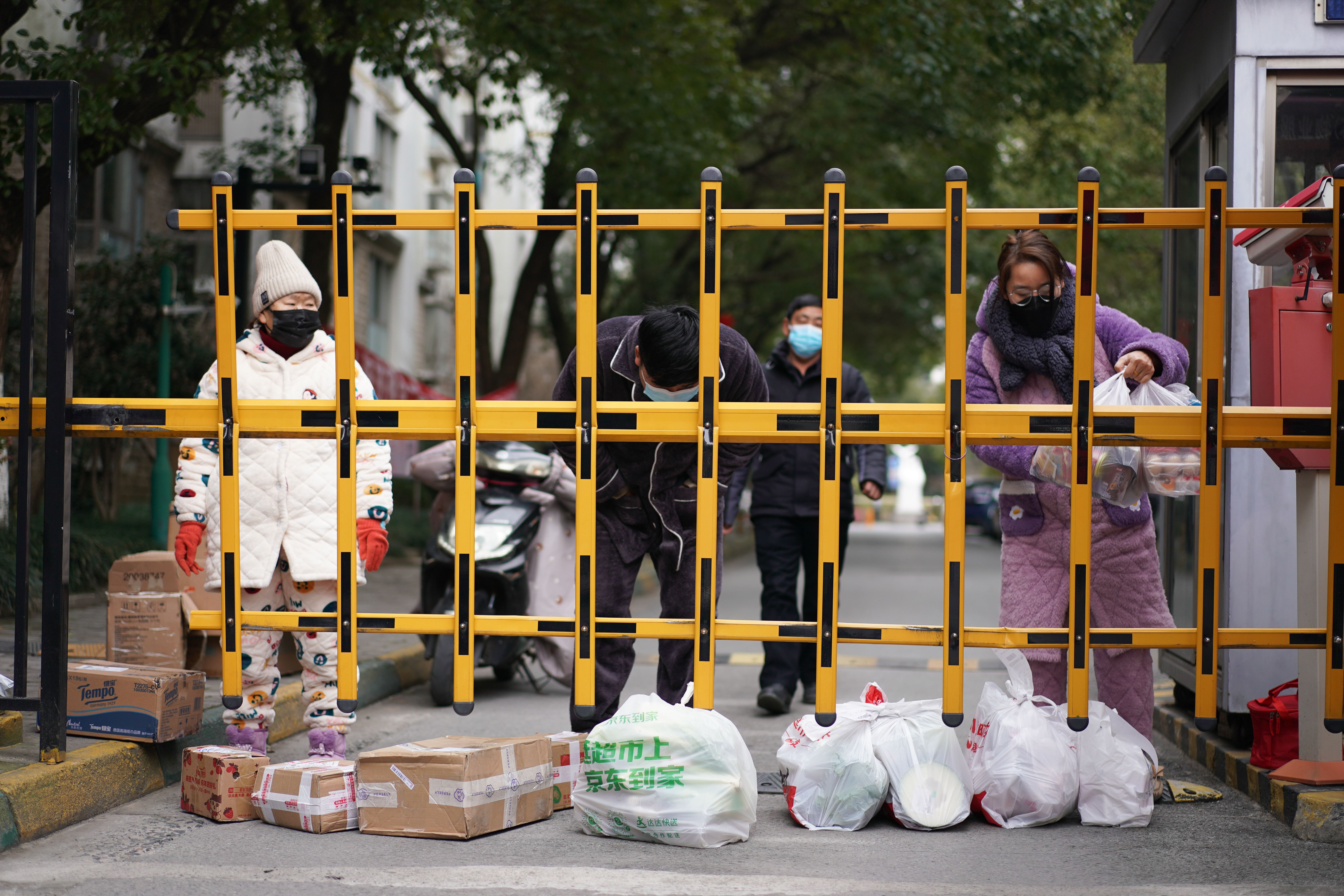 ▲2月16日,在苏州市姑苏区一封控小区门前,居民在取物资。 新华社记者/季春鹏 摄