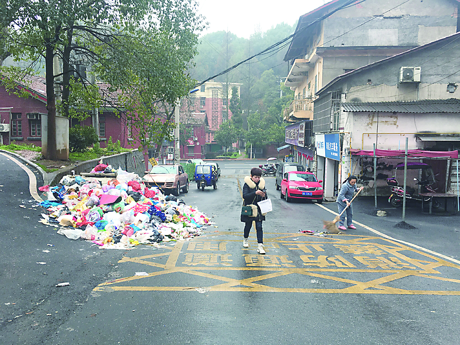 居民唐艳霞穿着睡衣、手持扫把对小区路面上的垃圾进行清扫。