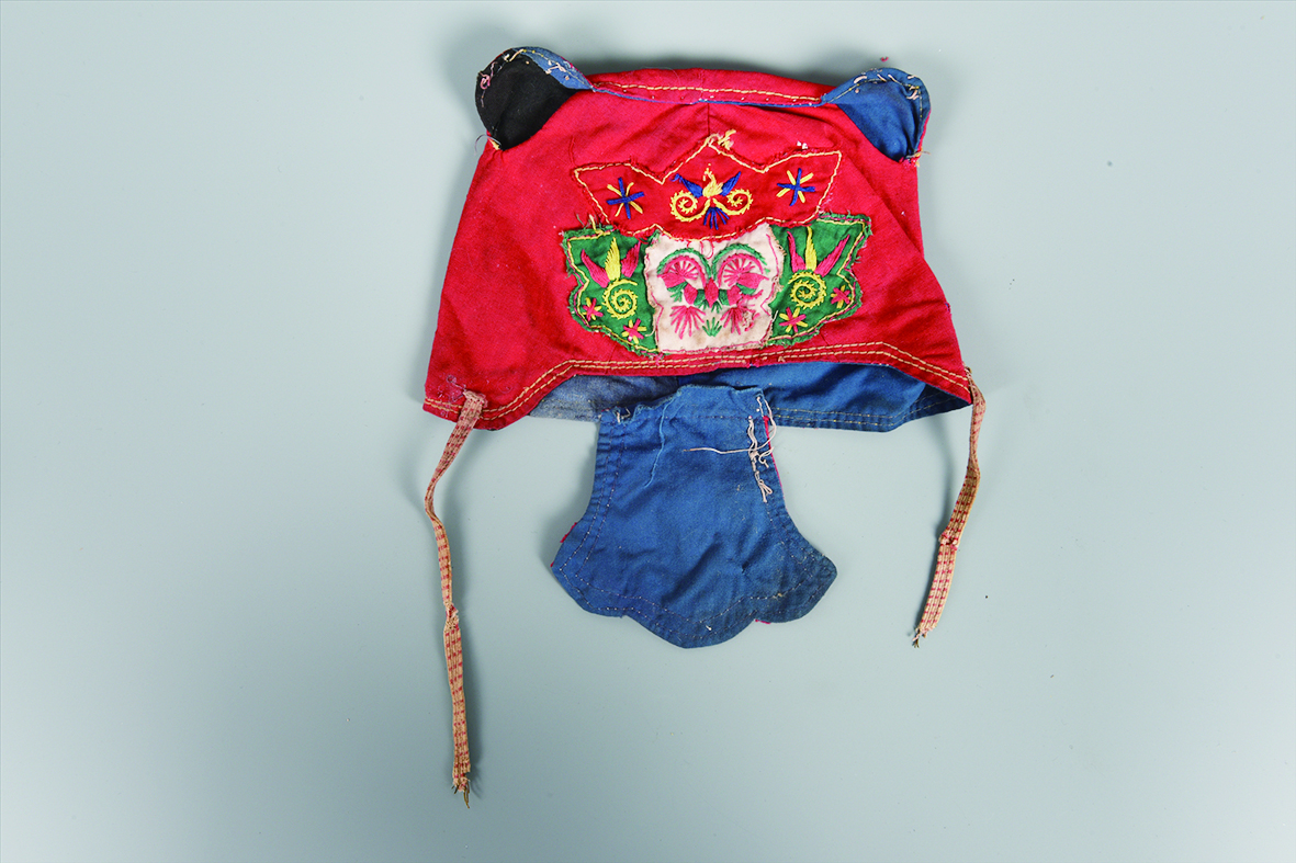 株洲博物馆收藏的民国时期的虎头童布鞋、虎头童布兜、鸟兽花卉棉布虎头帽,因衣帽上的纹饰状如虎头而得名。憨态可掬的虎头鞋帽既有实用价值,也有观赏价值,是当时人们为孩子求吉的物件,主要是初生的婴幼儿穿用。