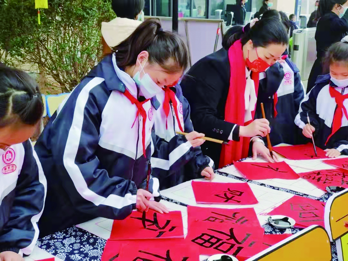在学校门口,最受欢迎的还有“冰墩墩”与“雪容融”一起迎接同学们归校。开学首日,每位到校的学生,可以和家长、老师一起写下自己的新年“福”字,学校还请来了非物质文化遗产的第三代传人李老师来校教孩子们剪纸,用中国传统的形式迎接新学期。
