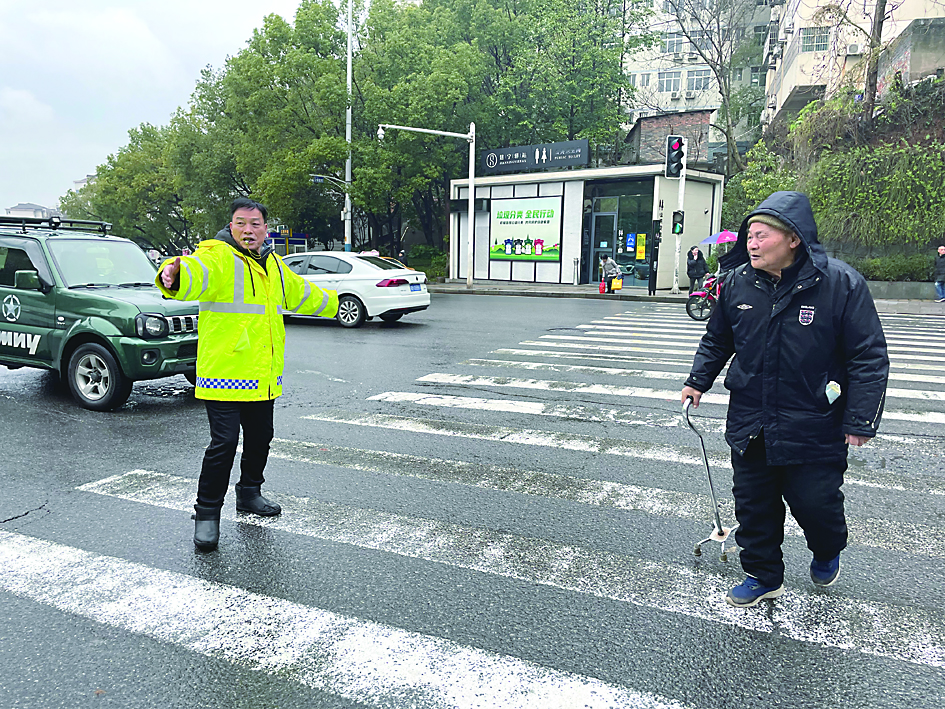 ▲“孺子牛”志愿服务队员引导行人过马路。 记者/谢嘉 摄