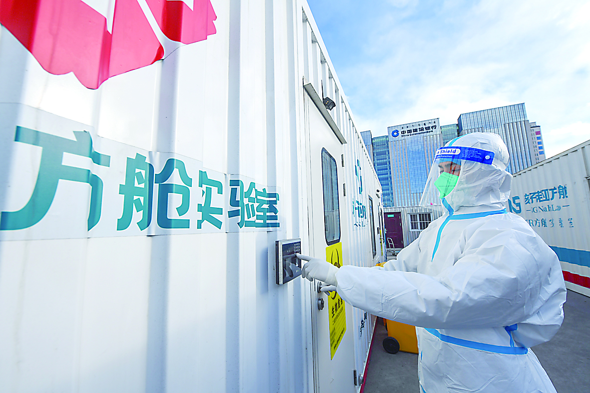 ▲为提升核酸检测效率,呼和浩特市卫健委协调第三方检测机构,通过增设PCR方舱和气膜实验室等,助力“追踪”病毒。图为2月20日工作人员输入密码,准备进入方舱实验室。 新华社记者/彭源 摄