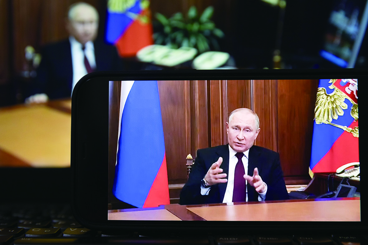 ▲2月21日在俄罗斯首都莫斯科拍摄的俄总统普京发表电视讲话的画面。新华社记者/白雪骐 摄