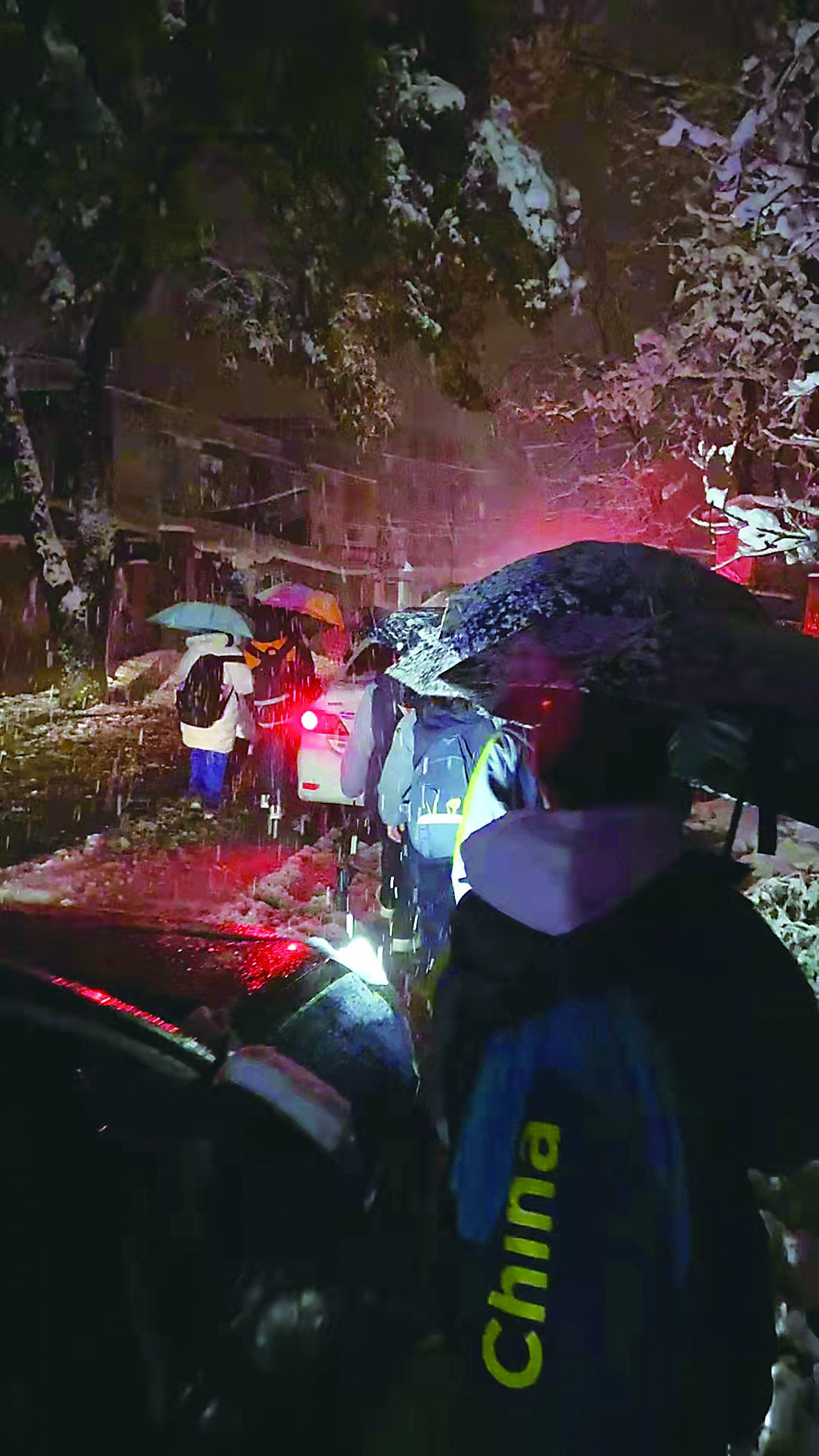 晚上9点,雪仍在下,受陡坡地形影响,学校周边交通状况依然不佳。通过与家长的进一步沟通,6名同学在饭店继续等候家长,其他27名同学则组成“小分队”,在老师的带领下,沿株渌路步行前往交通状况较好的三三一南华花园小区与家长汇合。