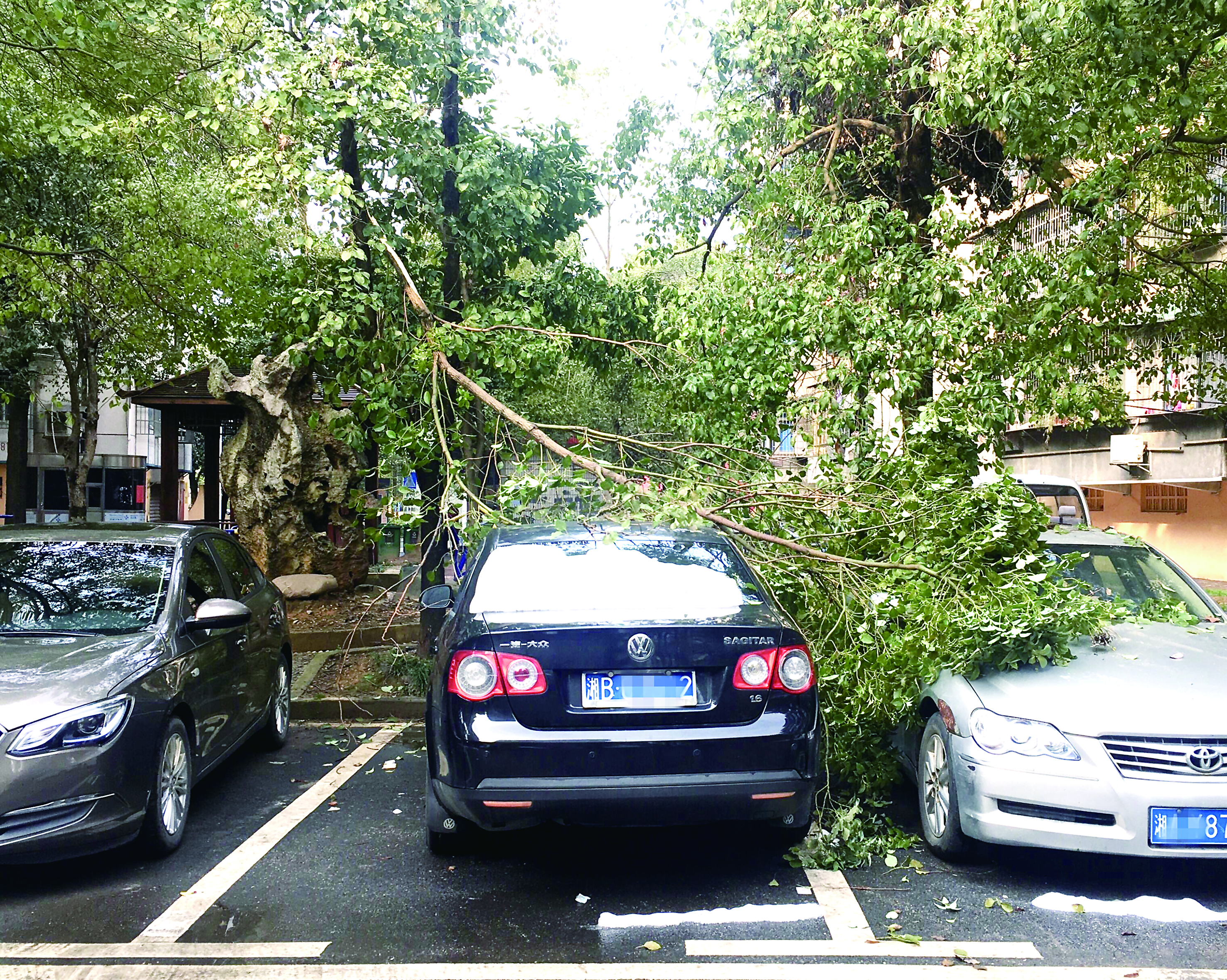 图为一居民小区,大树上悬挂着断枝。