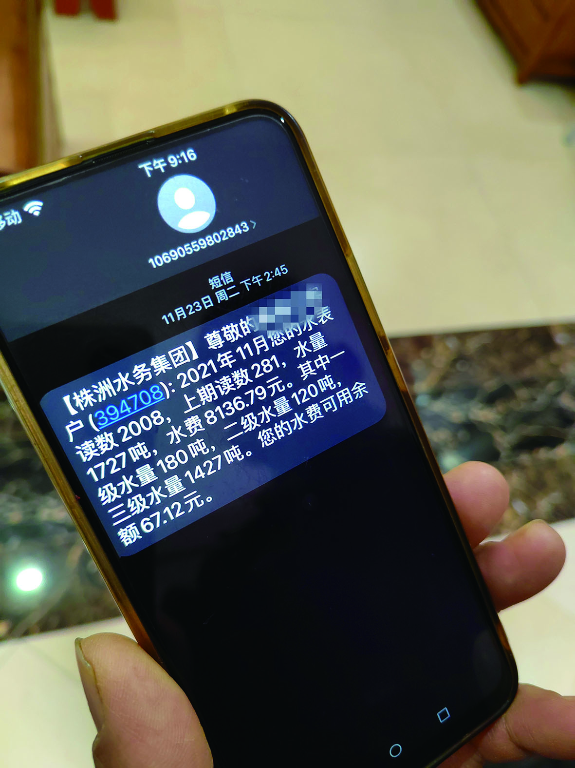 ▲株洲水务集团发送给彭先生的用水短信。受访者供图