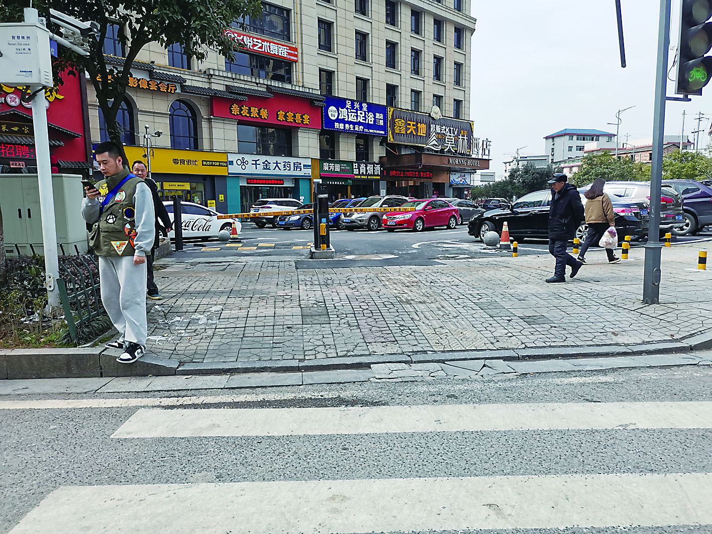 ▲莫林酒店前坪停车场,出入口正对着斑马线。记者/姚时美 摄