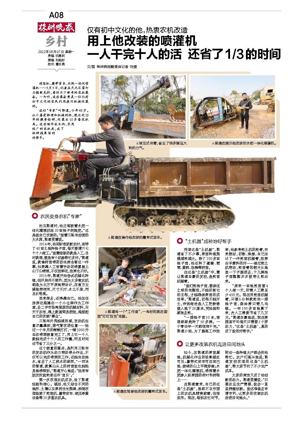 用上他改装的喷灌机 一人干完十人的活 还省了1/3的时间