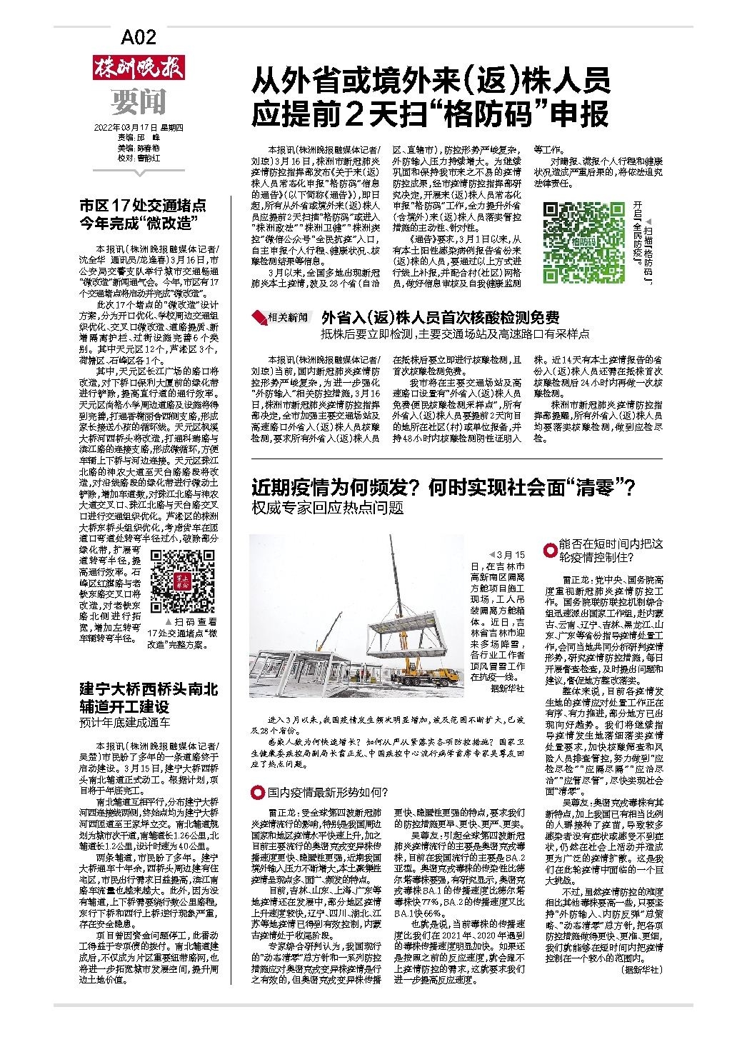 从外省或境外来(返)株人员 应提前2天扫“格防码”申报