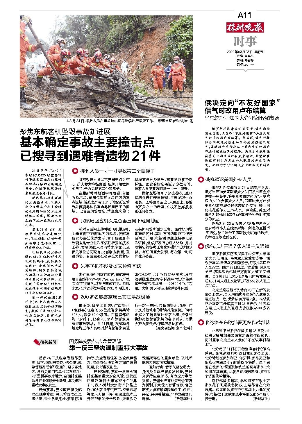 基本确定事故主要撞击点已搜寻到遇难者遗物21件