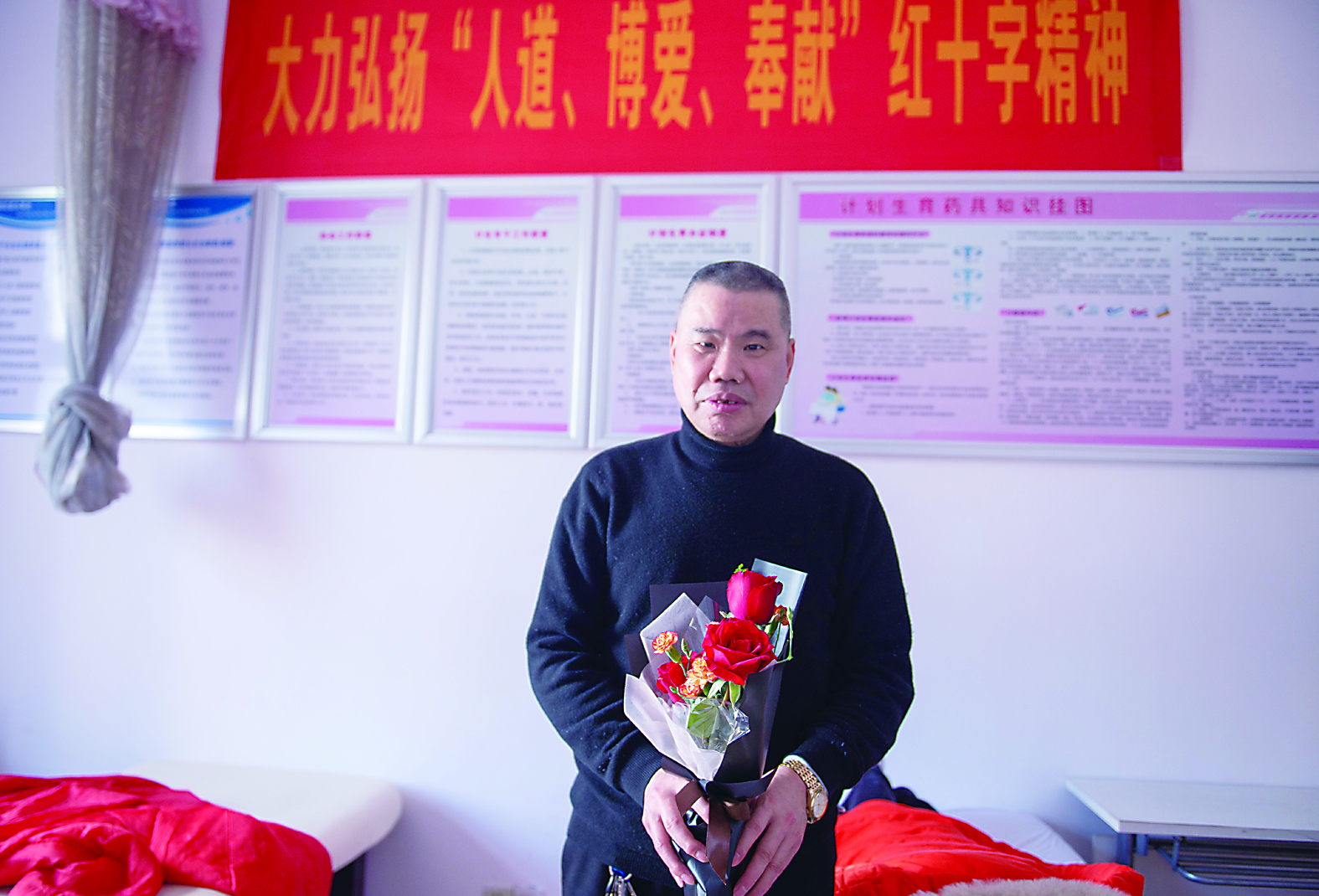 ▲3月2日,陈新建接过晚报和“土图花坊”联合送的鲜花,腼腆地笑了。记者/张媛 摄