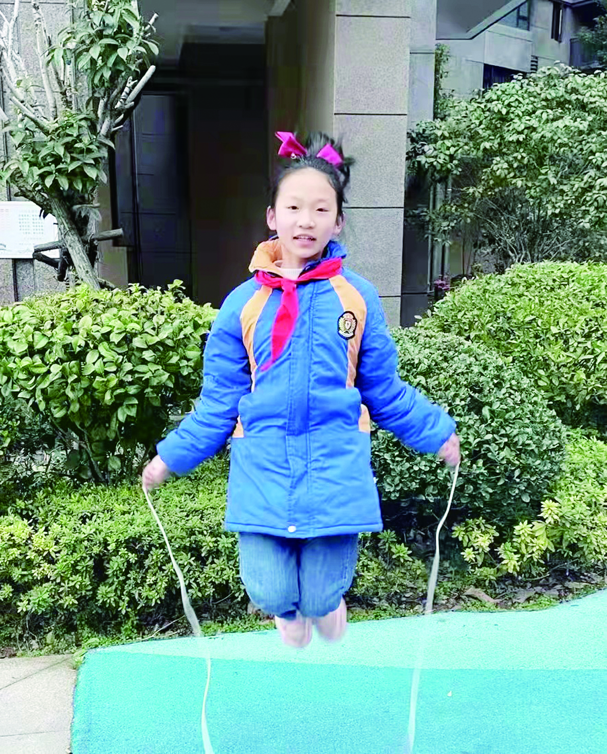这个寒假我没有往常那么多的作业,每天多了很多运动的时间。我最喜欢的运动就是跳绳,我会单脚跳、双脚跳、双脚轮换跳……在一上一下的跳跃中,我感到身心舒畅!