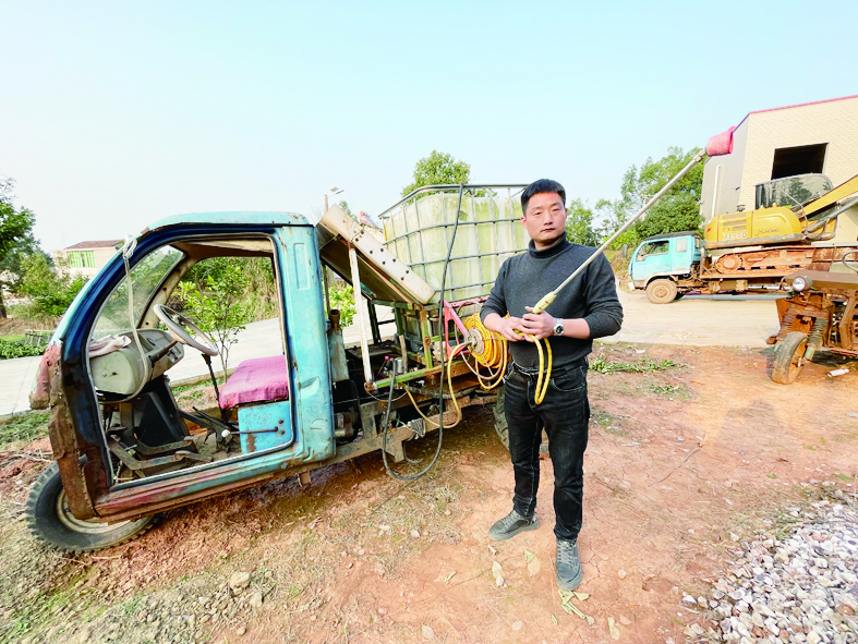 三轮车外壳能减则减,发动机位置尽量靠前,排气管改进位置……经过一个半月的敲敲打打,一辆1000升自动喷洒装置完工了,用上它一个人就能完成十个人的工作量,而且时间还节省了三分之一。