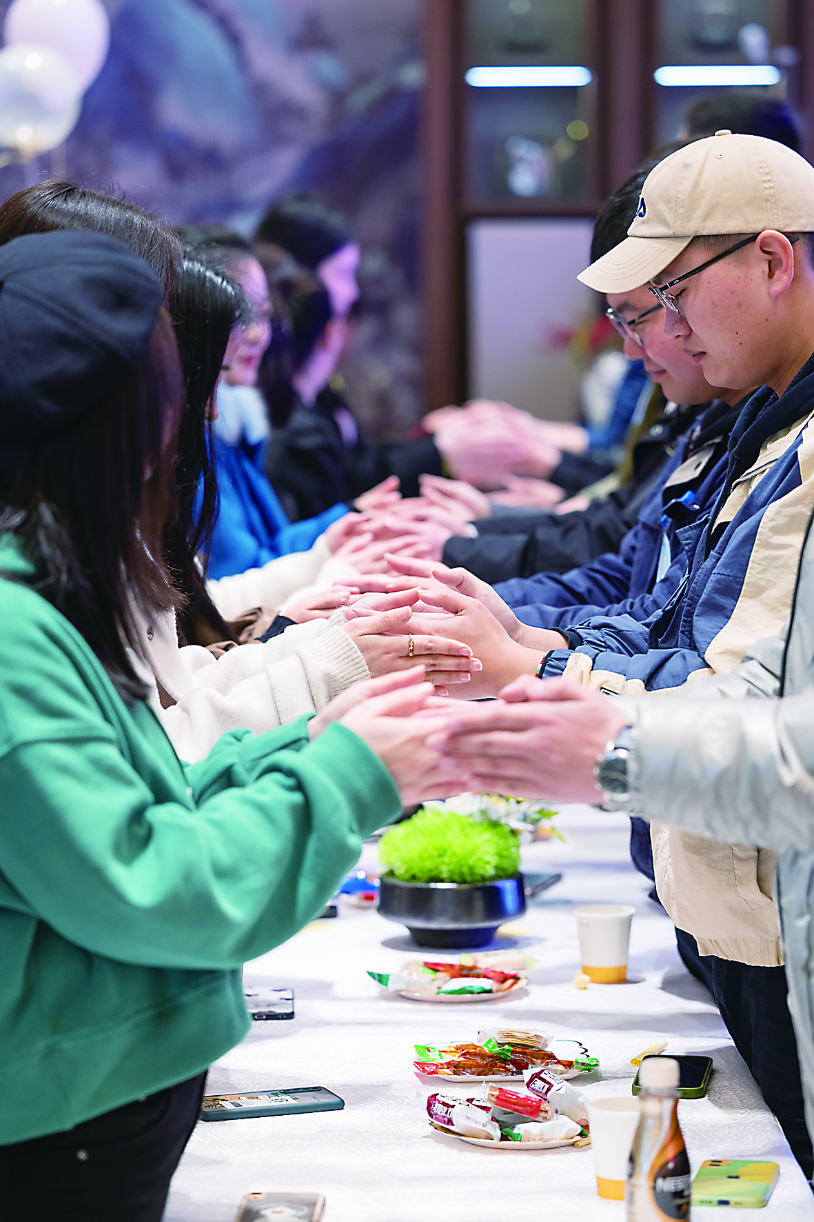 ▲游戏“惩罚”——选一位异性,为他(她)涂护手霜。