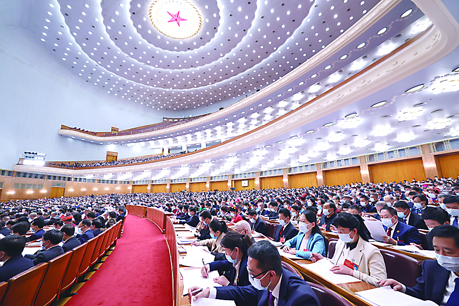 ◀3月8日,十三届全国人大五次会议在北京人民大会堂举行第二次全体会议。 新华社记者 刘卫兵 摄