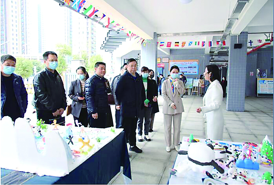 ◀石峰区考察团一行在砂子塘新世界小学欣赏学生特色手工作品。 通讯员/供图