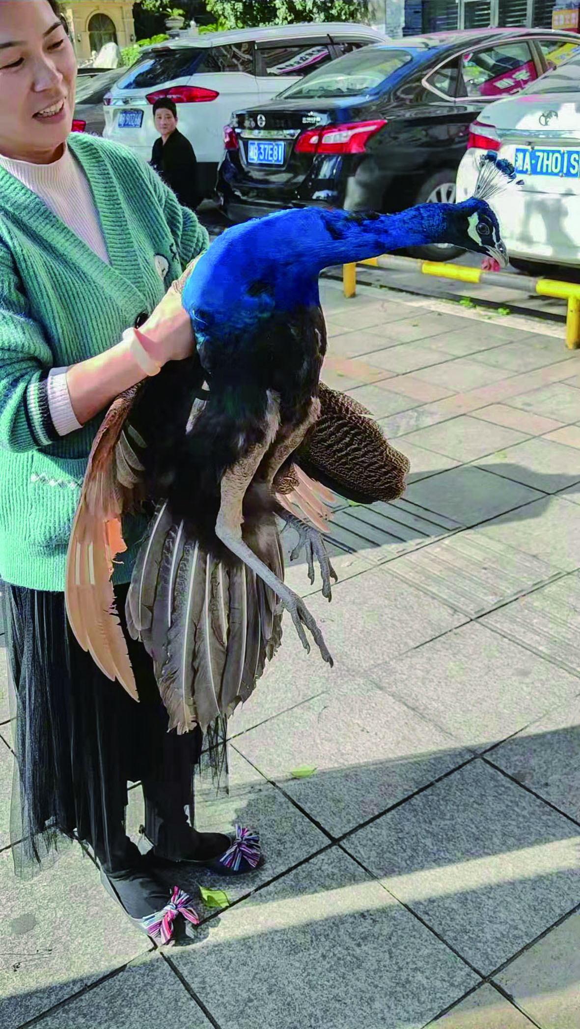▲饲养员抓到了“越狱”的孔雀。受访者供图