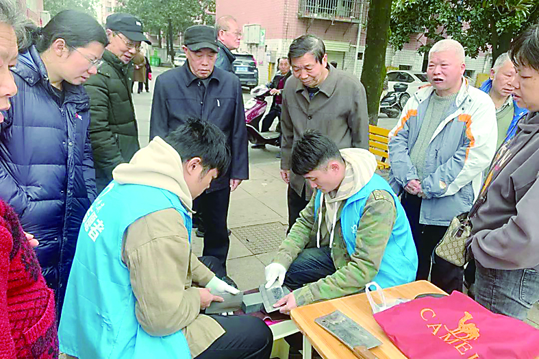 ▲南峰社区,志愿者为居民免费磨刀。 通讯员/谭玉蕾 摄