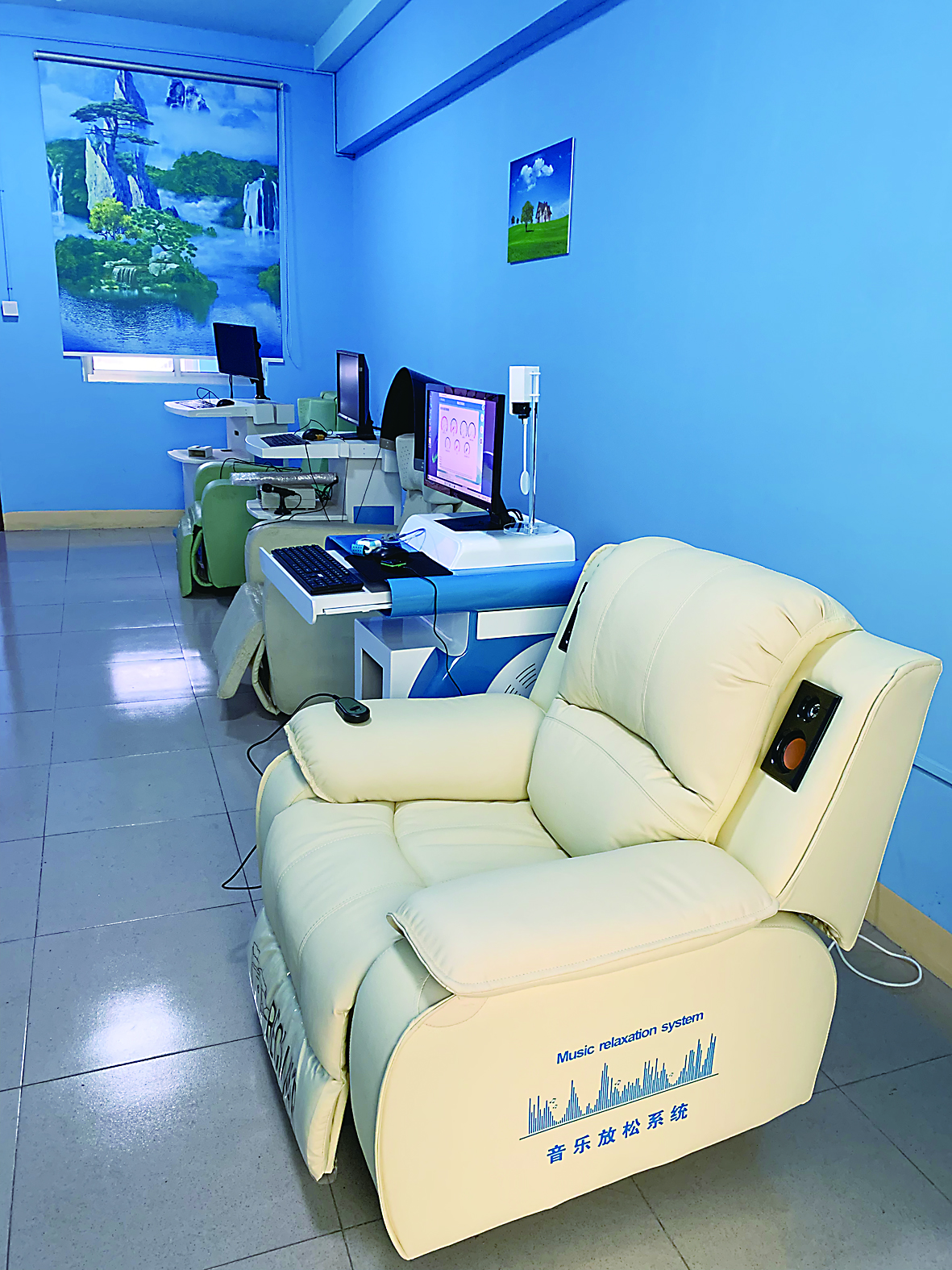 ◀部分学校心理辅导室,还配备了音乐放松沙发。 记者/戴凛 摄