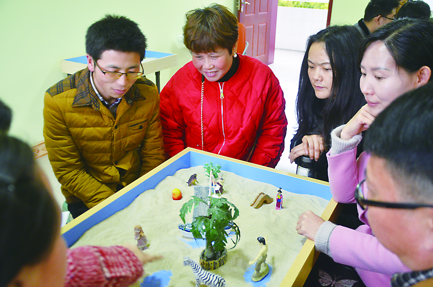▲心理教师进行心理沙盘培训。记者/戴凛 摄