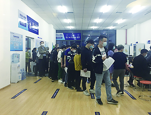 ▲市民中心负一楼接种点人员拥挤。 记者/刘平 摄