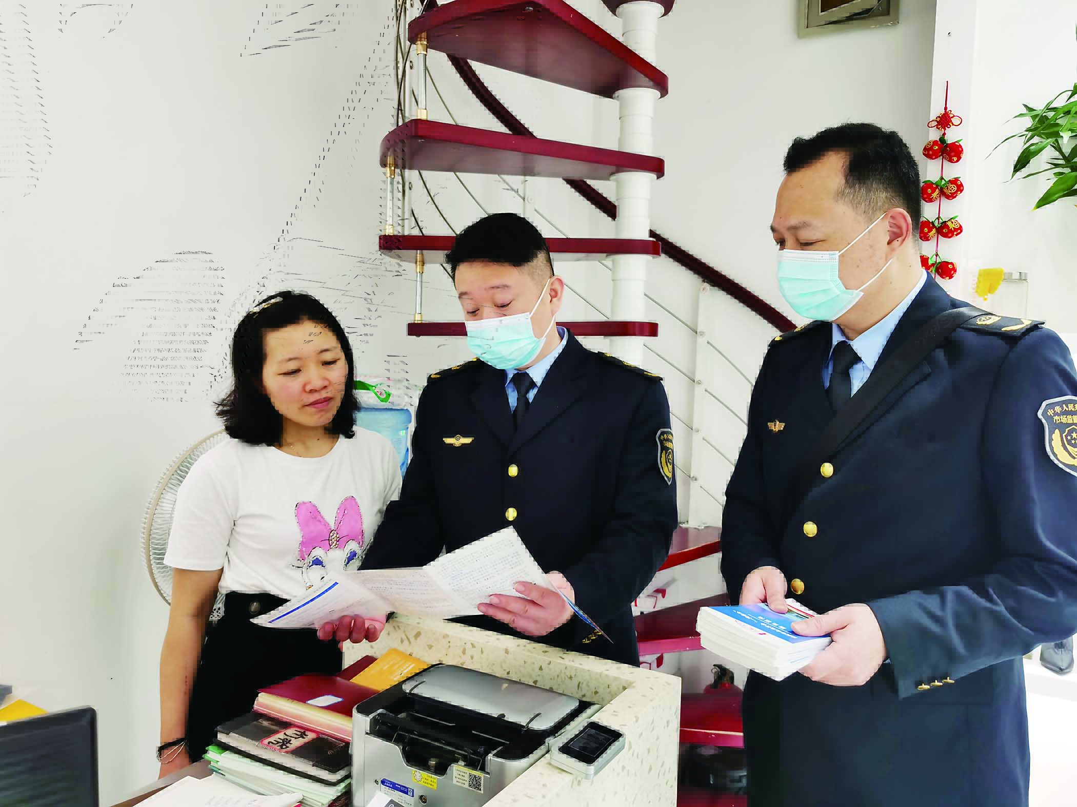 ▲芦淞区市场监管局工作人员给商户发放宣传资料。 记者/杨凌凌 摄