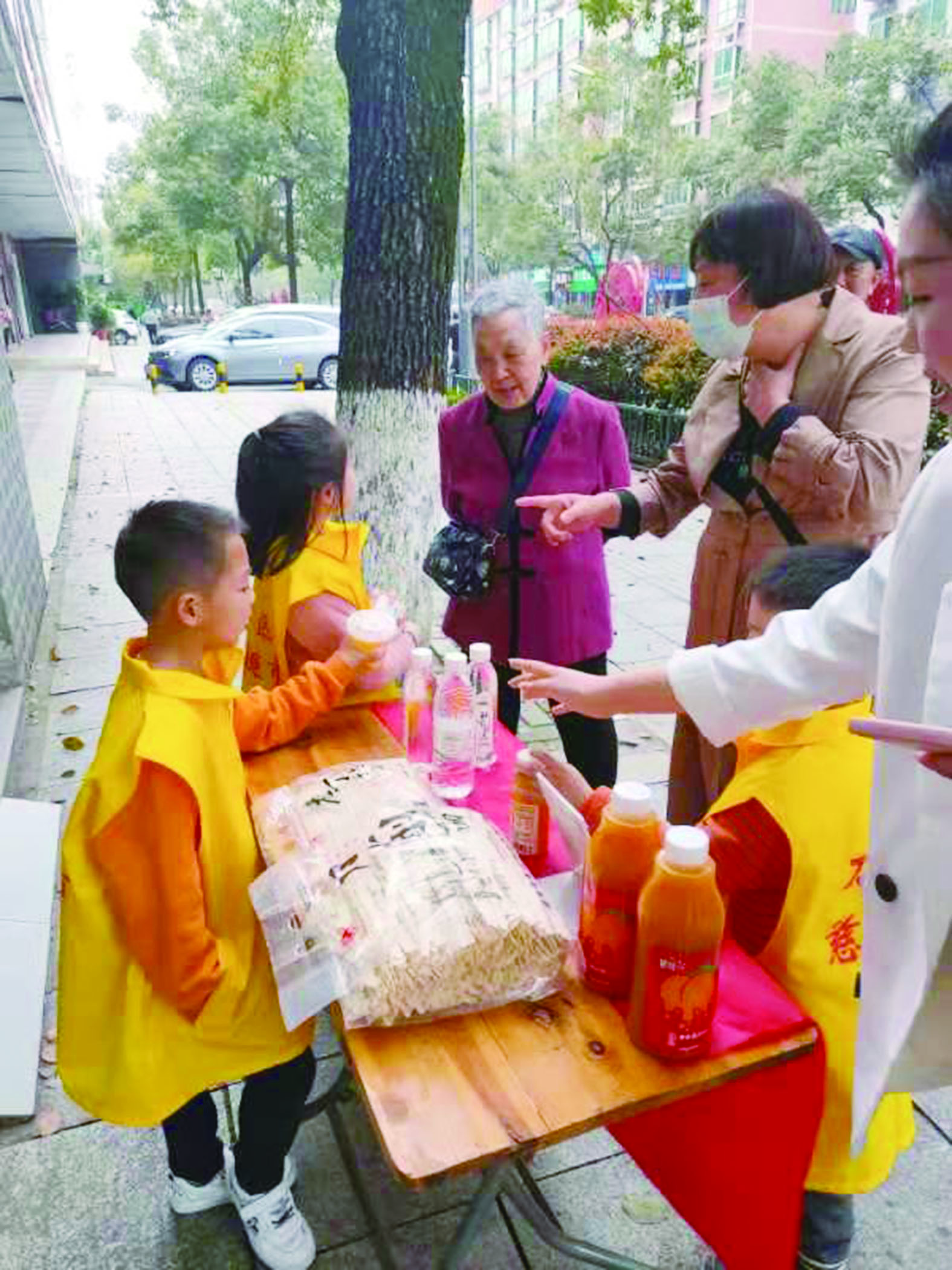 ▲小小营业员向行人推销慈善超市产品。志愿者供图