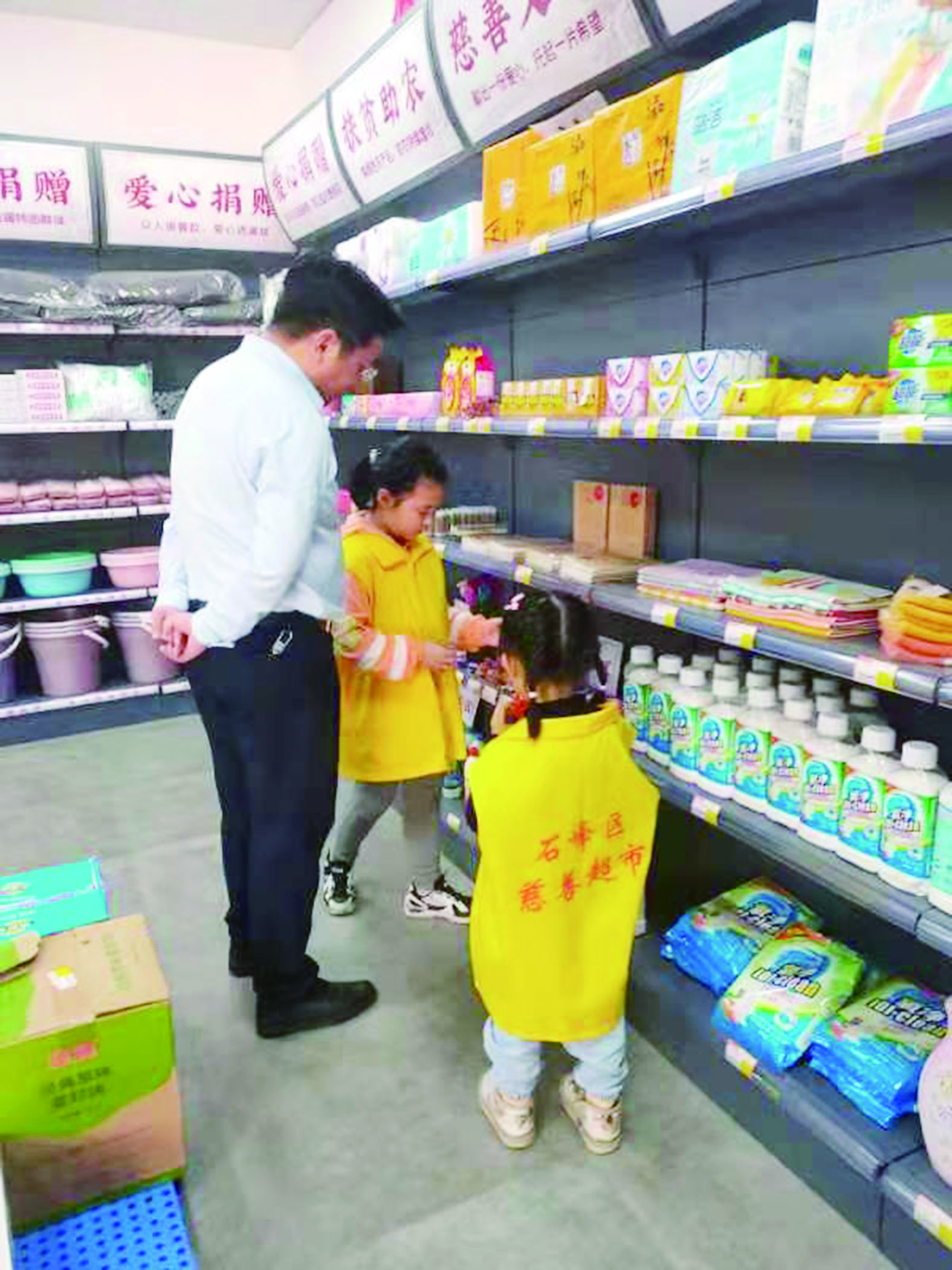 ▲小小营业员向顾客推销慈善超市产品。志愿者供图