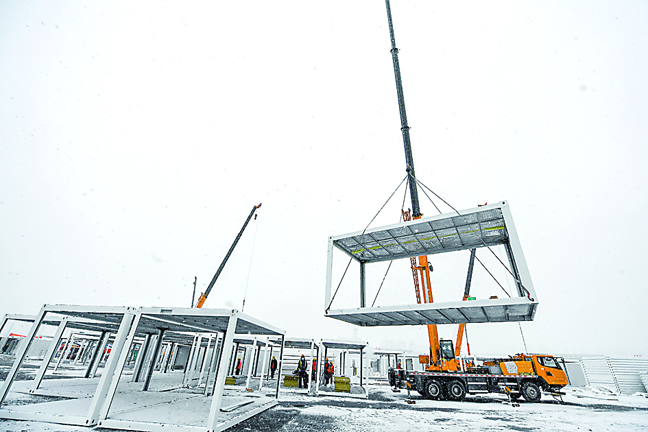 ◀3月15日,在吉林市高新南区隔离方舱项目施工现场,工人吊装隔离方舱箱体。近日,吉林省吉林市迎来多场降雪,各行业工作者顶风冒雪工作在抗疫一线。 据新华社