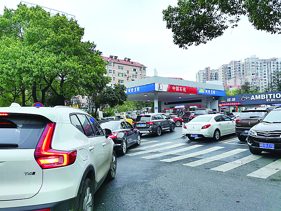 ▲3月16日下午,前来加油的汽车在长江北路上的加油站排起长龙。 记者/李军 摄
