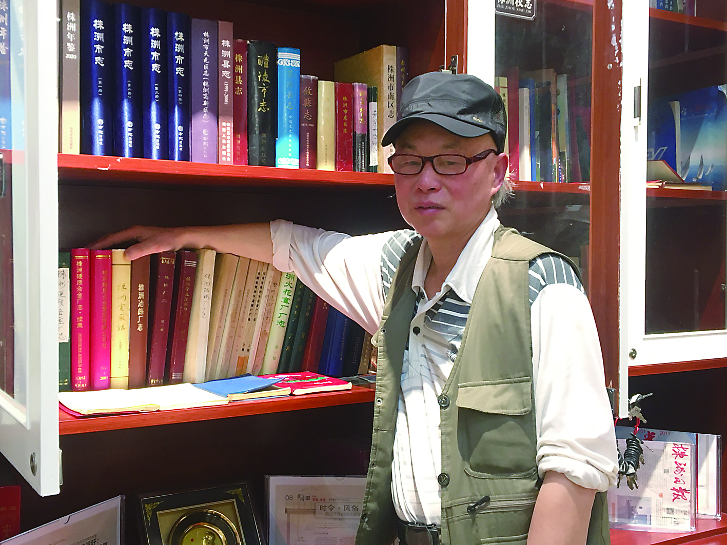 ▲仇民主收藏的几十本株洲市各厂厂志。 刘朵儿/摄