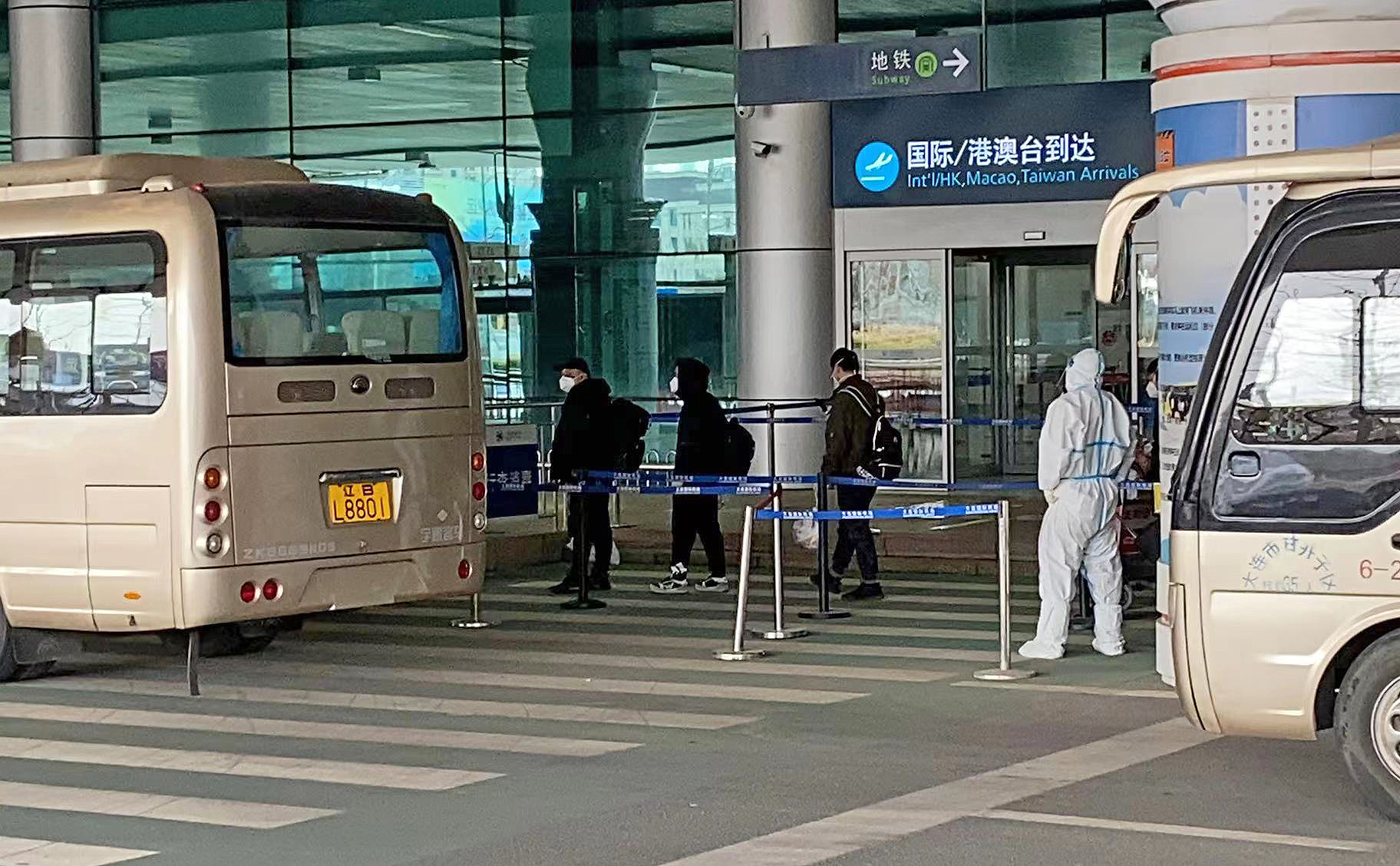 ▲3月16日下午2时32分,第十五架接返自乌克兰撤离中国公民临时航班安全抵达大连。图为乘坐临时航班安全抵达大连周水子国际机场的中国公民准备前往隔离酒店。 新华社发 /大连机场提供