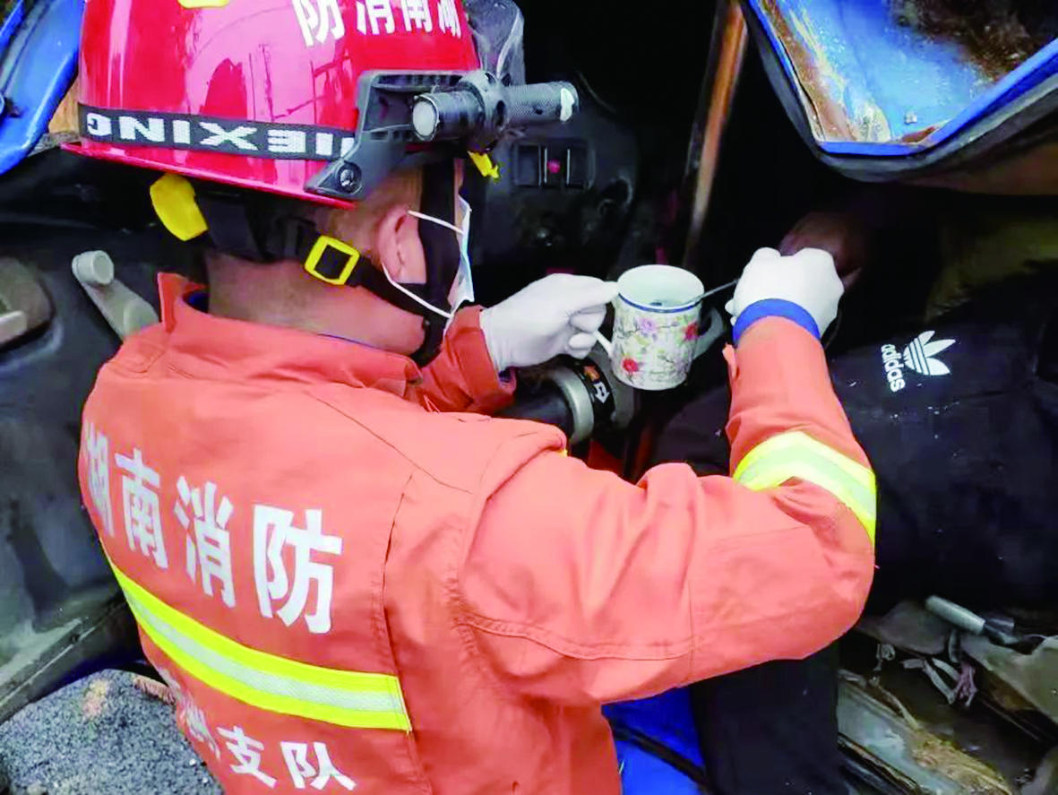 ▲救援人员给被困司机喂水。通讯员供图