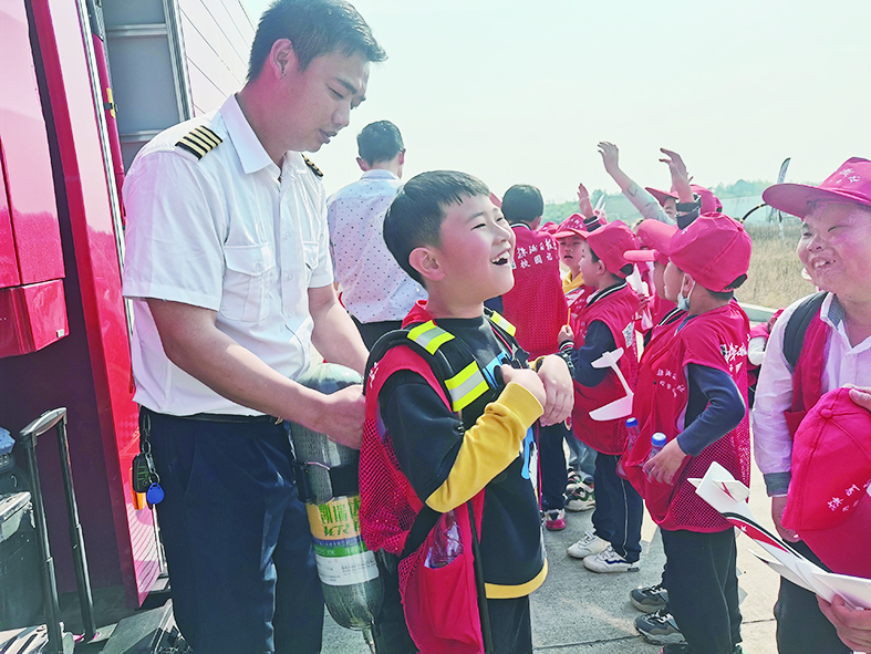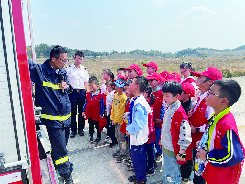一辆大红色的消防车驶入机场停车坪,从消防车上走下来酷酷的消防员叔叔。“客机坪发生溢油时应立即用吸收剂覆盖并清除干净……”了解和学习机场消防知识后,校园记者还依次登上消防车顶端,在消防人员协助下亲手打“水炮”。长长的白色水带在空中画出漂亮的抛物线,引得孩子们阵阵欢呼。