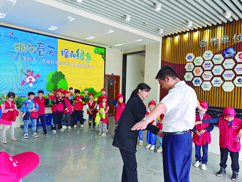 “航空旅行,为什么上飞机前要进行安检,违禁物品有哪些……”学习安检知识后,校园记者马上变身小小安检员,认真地为“旅客”进行安检,检查完毕后才礼貌放行。