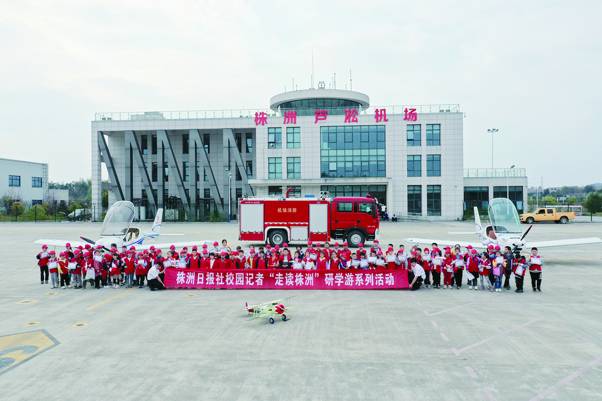 当日,株洲日报社校园记者俱乐部组织百余名校园记者来到芦淞机场航空科普基地,开展“小小飞行员”航空体验和植树活动。