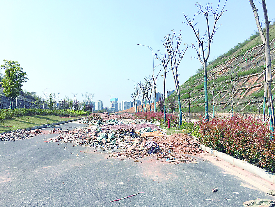 ▶道路中断后,不少建筑垃圾倾倒在路上。 记者/刘平 摄