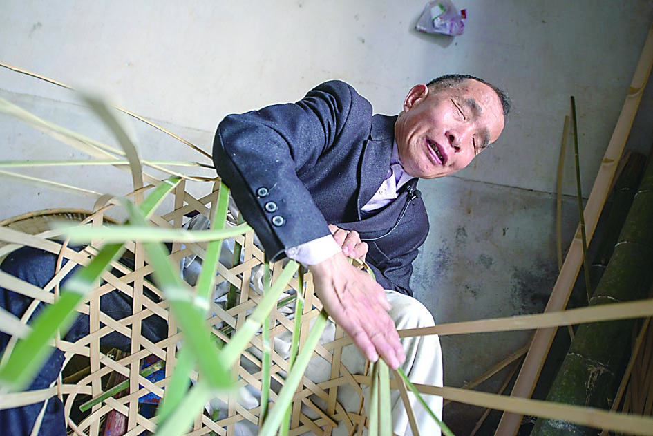 ▲靠着50多年的经验,谭光明熟练地编着竹篾。 记者/张媛 摄