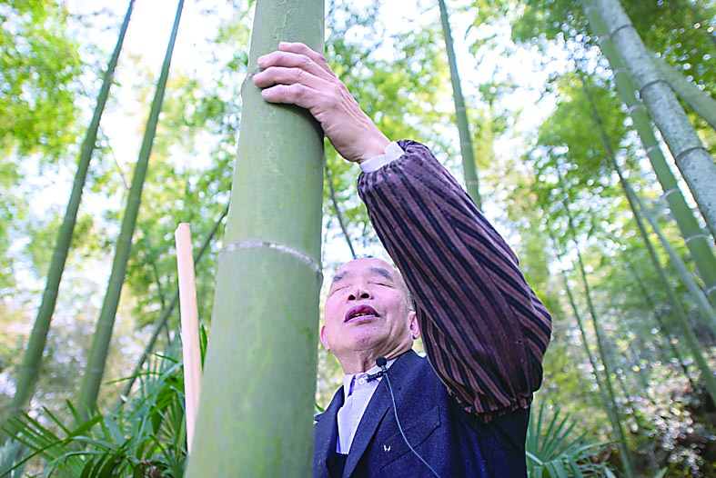 ▶摸竹节听竹声,谭光明即可辨认出竹龄。 记者/张媛 摄