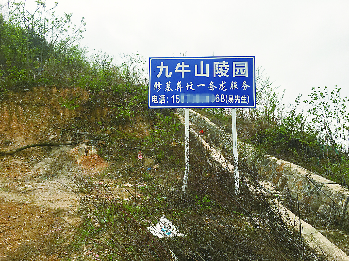 ▲村民在九牛山上竖牌招揽殡葬业务。记者/刘平 摄