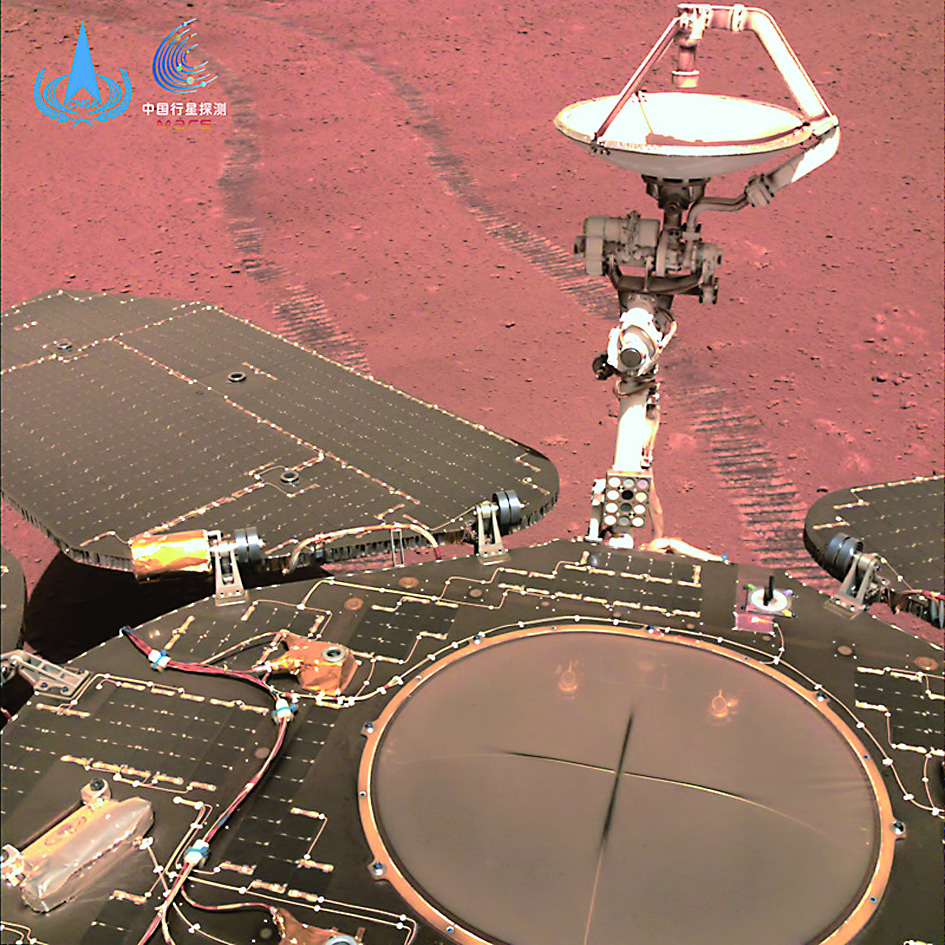 “祝融号”火星车也从火星表面传回自拍照,相比刚刚着陆时拍的照片,可以看出火星车表面已积累了一层薄薄的沙尘。同时,通过火星车的遥测信息判断,太阳翼的发电效率受到一定影响,但能源仍然充足。为了应对沙尘覆盖,火星车太阳翼进行了特殊设计,可采取多种措施应对沙尘引起的发电效率下降问题,目前尚无需使用,当前能源状态足以支持火星车继续行驶并开展探测。