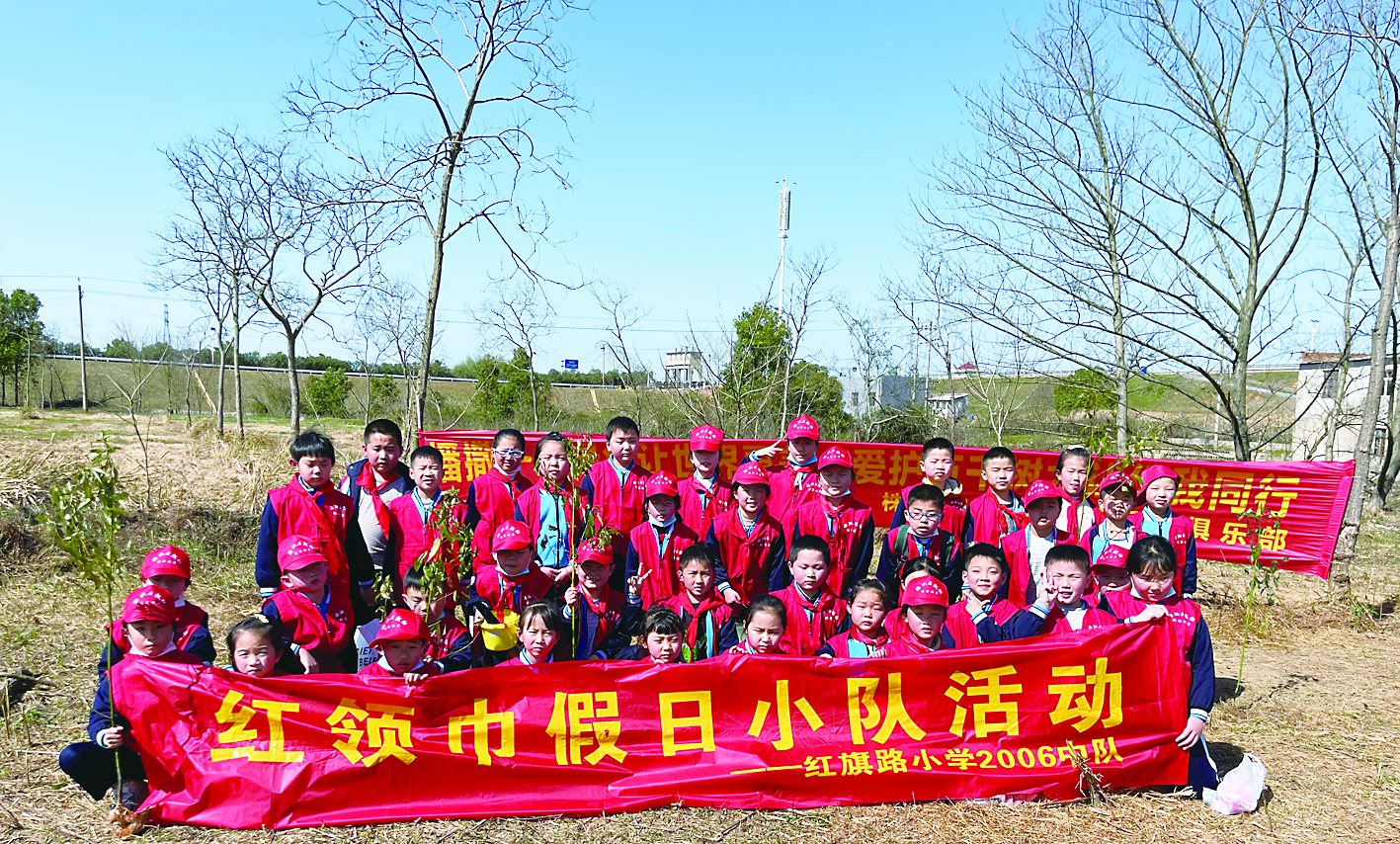 ◀红旗路小学校园记者班植树活动合影。 校方供图