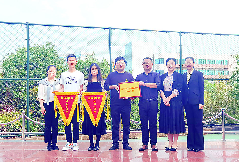 ▲3月14日,株洲建宁实验学校举办株洲日报社校园记者站、校园记者班授牌和授旗仪式。校长曾亮(右三)寄语校园记者用辩证、求真的态度去观察身边的人和事。图为授牌、授旗仪式现场。记者/刘文 摄