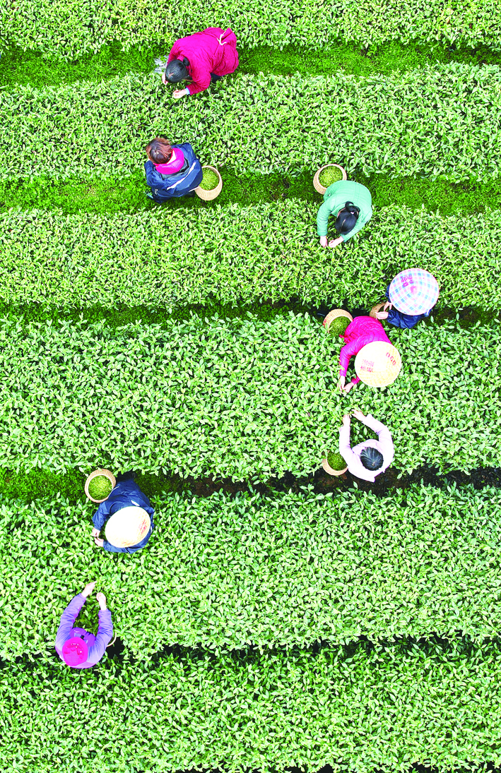 ▲3月27日,采茶工在杭州西湖区的西湖龙井一级保护区的茶园里采摘西湖龙井明前茶的嫩芽(无人机照片)。新华社发/龙巍 摄
