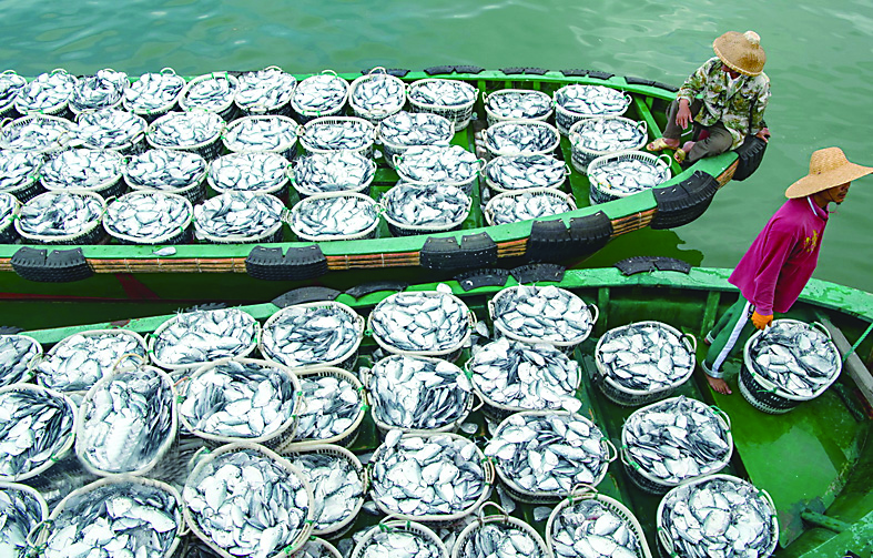 ▲3月3日,海南省万宁市乌场港,一只只接驳小船满载海鱼返港等待卸货。人民图片网/蒙钟德 摄