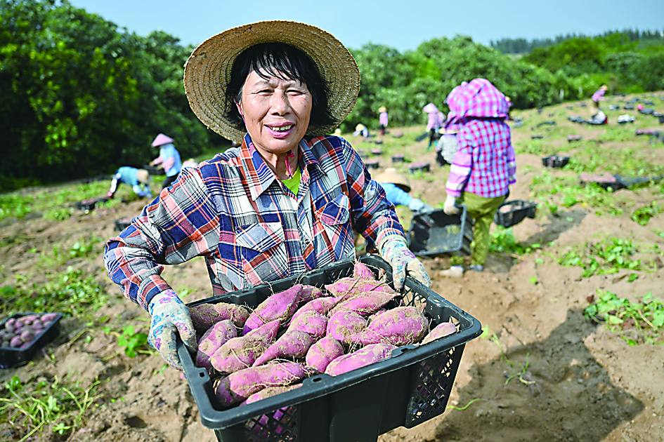▲3月26日,工人在文昌市昌洒镇田间展示刚采收的地瓜。 新华社记者/郭程 摄